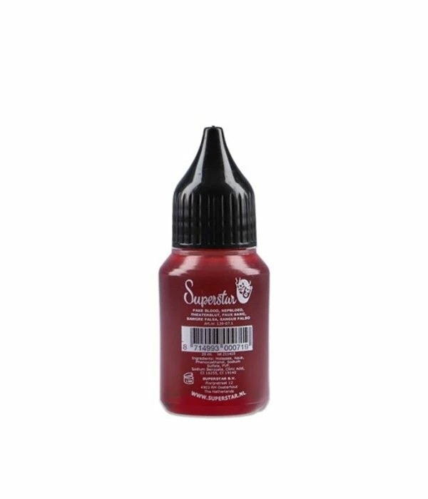Superstar Nep Bloed, Hel Rood Dik stollend is een mooi en helder kunstbloed. Het is vrij dik en blijft mooi op de aangebrachte plek zonder uit te lopen en kan gebruikt worden voor het maken van o.a. bloederige wonden. Het bloed stolt. Door licht en donker bloed te combineren creëer je een mooi resultaat. Ideaal voor wonden en Halloween. Superstar Nep Bloed Hel Rood Dik zit verpakt in een plastic fles met handige doseerdop.