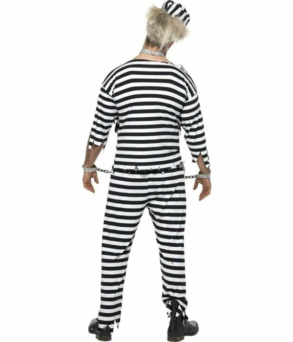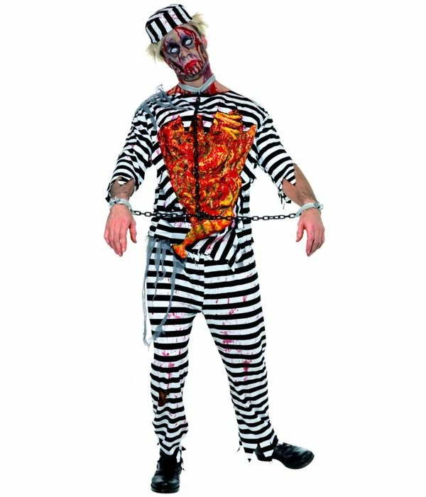 -Zombie boevenpak bestaande uit: gestreepte broek met bloedvlekken, gestreept shirt met latex middenstuk (wond), gestreepte pet, handboeien